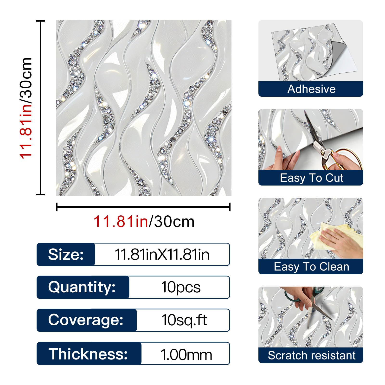 IVN 10PCS 12x12 Inch Peel and Stick Floor Tiles Silver Wavy Pattern with Crystal Texture Accents Removable Self Adhesive DIY Vinyl Flooring Stickers for Entryway Kitchen Bar Studio Home Decor
