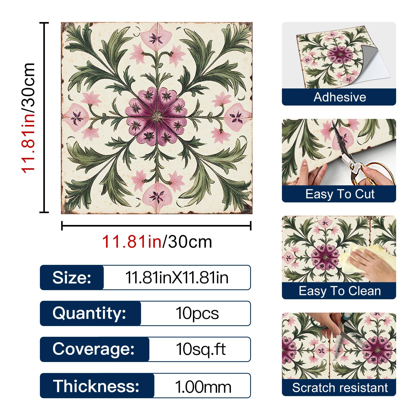 IVN 10PCS 12x12 Inch Vintage Peony Vine Pattern Peel and Stick Floor Tiles for Living Room Bedroom Bathroom Entryway Reading Nook Decor