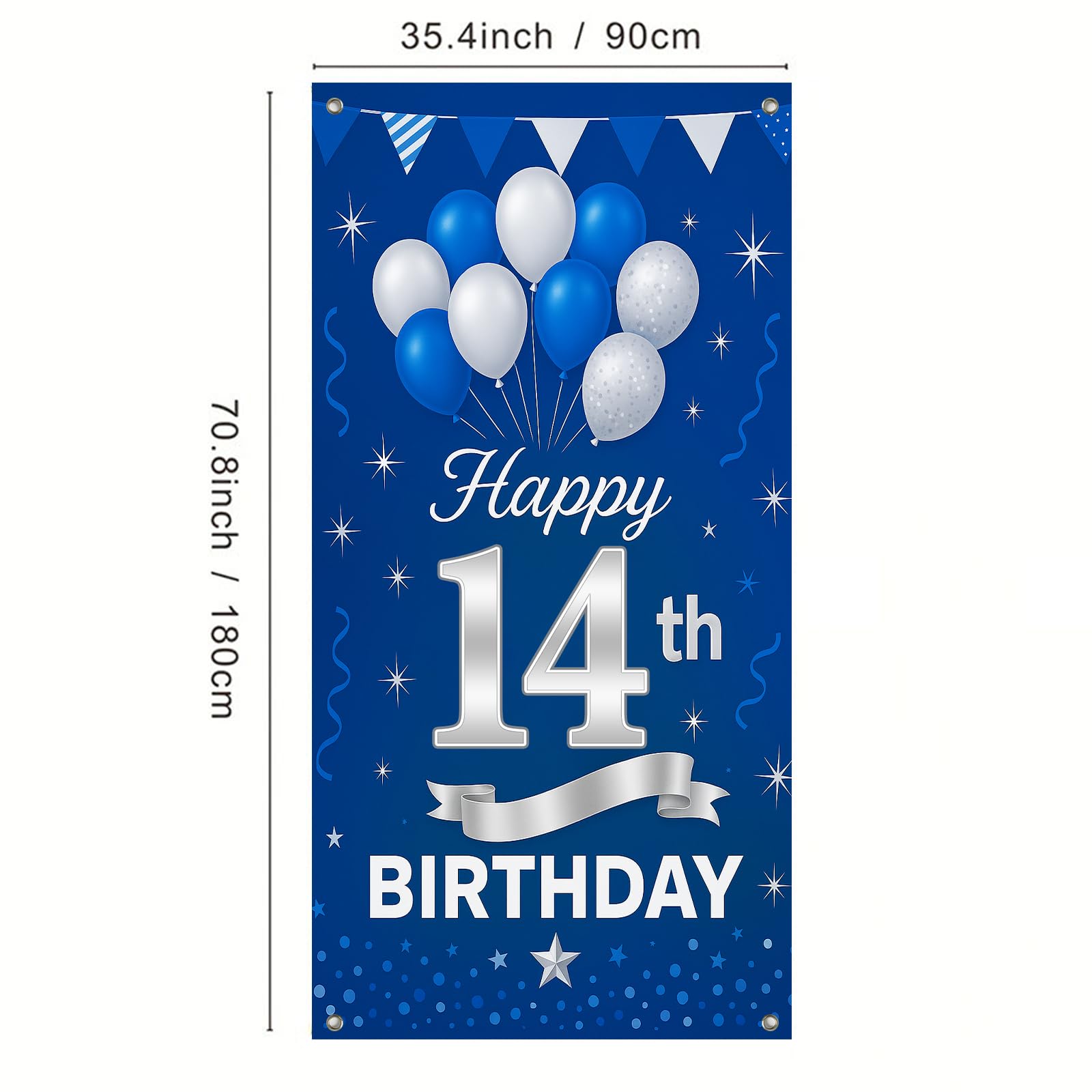 IVN 14th Birthday Door Cover 71x35 Inch Blue Silver Birthday Banner for Party Decorations Balloons Stars Backdrop Sign for Teens Boys Girls Photo Booth Prop Wall Decorā