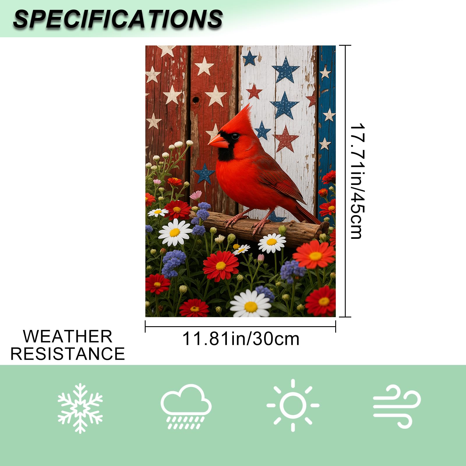 - Special Americana Country Design: A vibrant red bird stands boldly in front of a rustic wood star board surrounded by bright daisies and red flowers offering timeless seasonal charm for all year outdoor patriotic home decor
