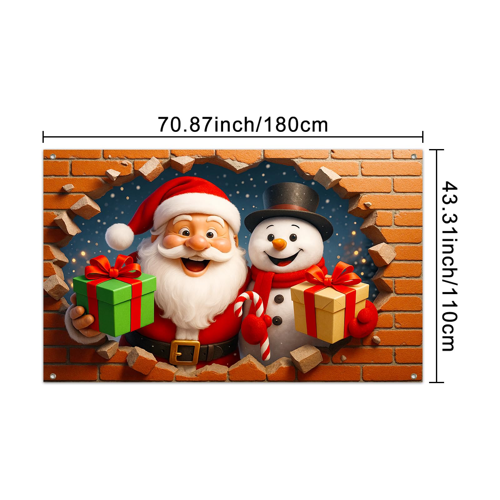- Special Santa & Snowman Design: Santa waves beside a cheerful snowman as both pop through a torn brick frame with stacked gifts and tiny stars. Bright color and playful depth make a lively backdrop for school events, patios, porch rails, or festive family pictures.