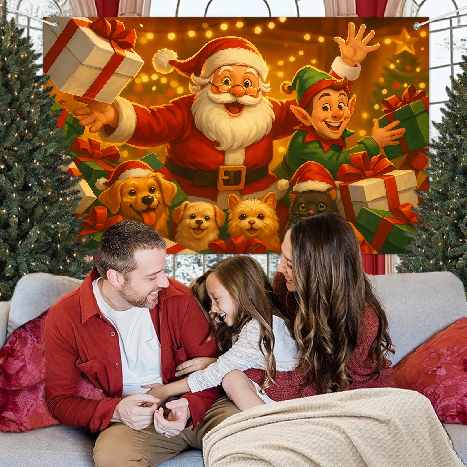IVN Christmas Banner 71 x 43 Inches Santa Claus and Pets with Gifts Background Indoor Outdoor Party Decorations and Photography for Home and Events Wall Porch Fence Hallway Entryway Banner Decor