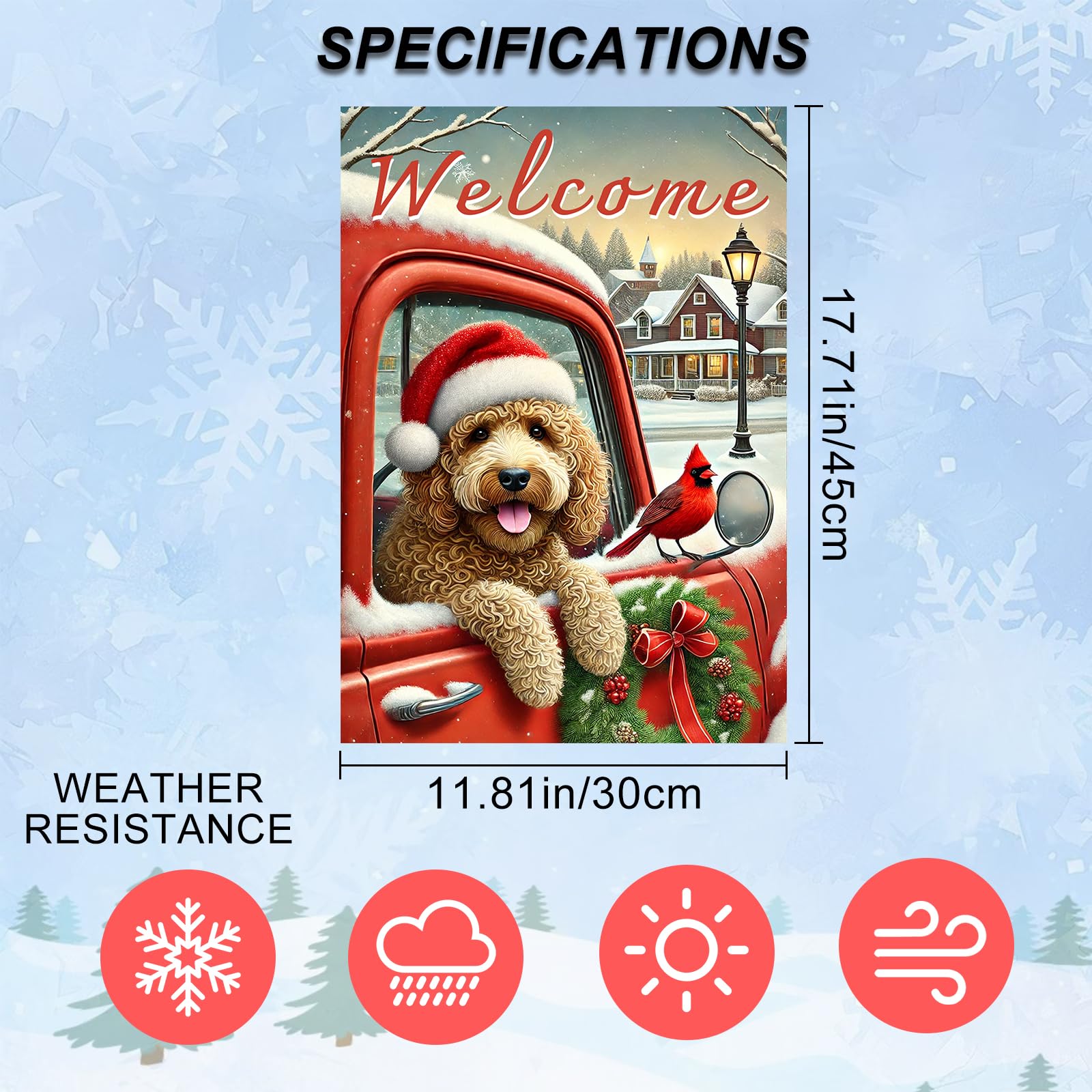 - Special Winter Welcome Design: A curly-coated pup in a Santa hat leans from a red pickup window beside a ribboned wreath and a red bird, with houses and lamplight in soft snowfall. Warm reds and creams set a friendly accent for porch or path.