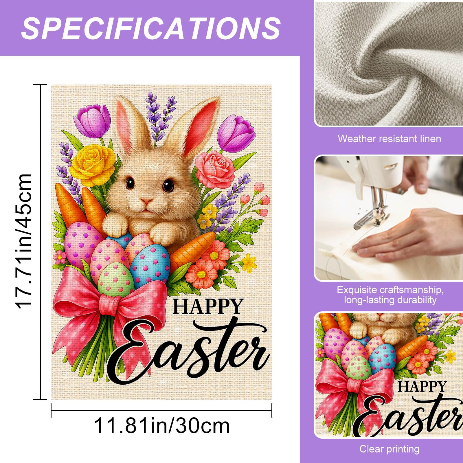 IVN Easter Bunny Garden Flag 12x18 Linen Happy Easter Bunny Carrots Eggs Floral Bouquet Spring Bow Watercolor Double Sided Yard House Flag Seasonal Out