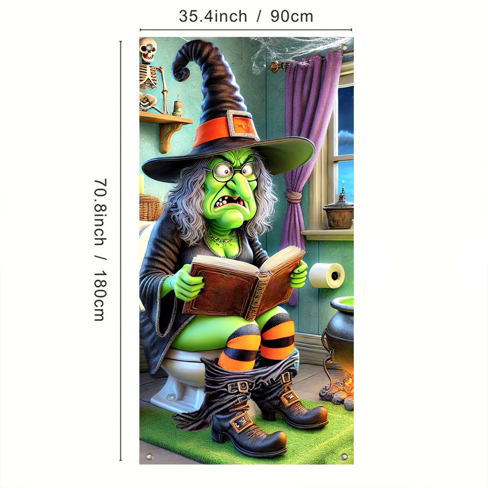 IVN Halloween Door Cover Banner 71x35 Inch Holiday Front Porch Door Decoration Funny Witch On Toilet Reading Spell Book Spooky Skeleton Cauldron for Party Trick or Treat Indoor Outdoor Decor