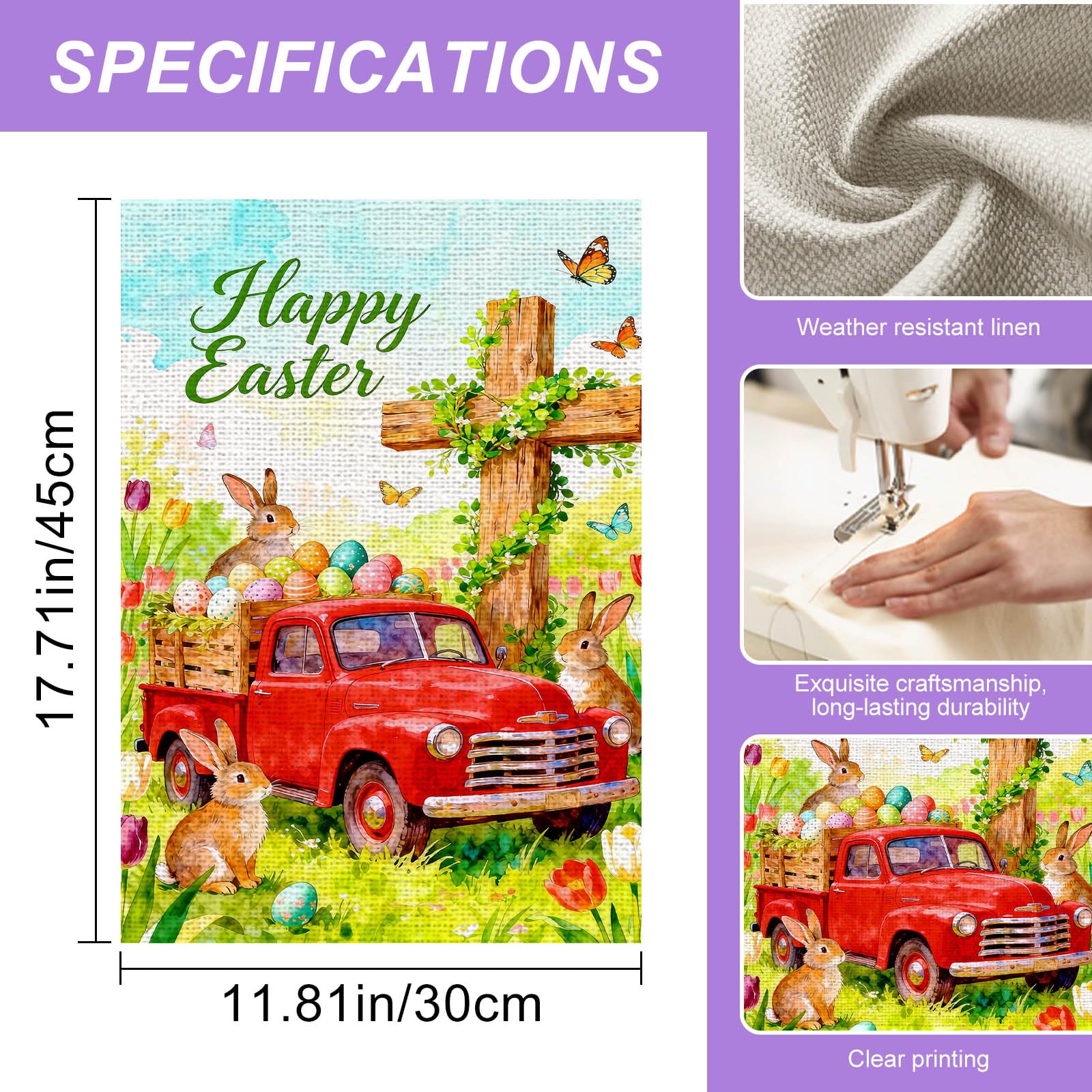 - Special Easter Farm Truck Design:A charming spring scene featuring a vintage red truck filled with colorful Easter eggs, surrounded by blooming flowers, butterflies, and playful bunnies, creating a cheerful and welcoming easter garden flag for seasonal outdoor décor.