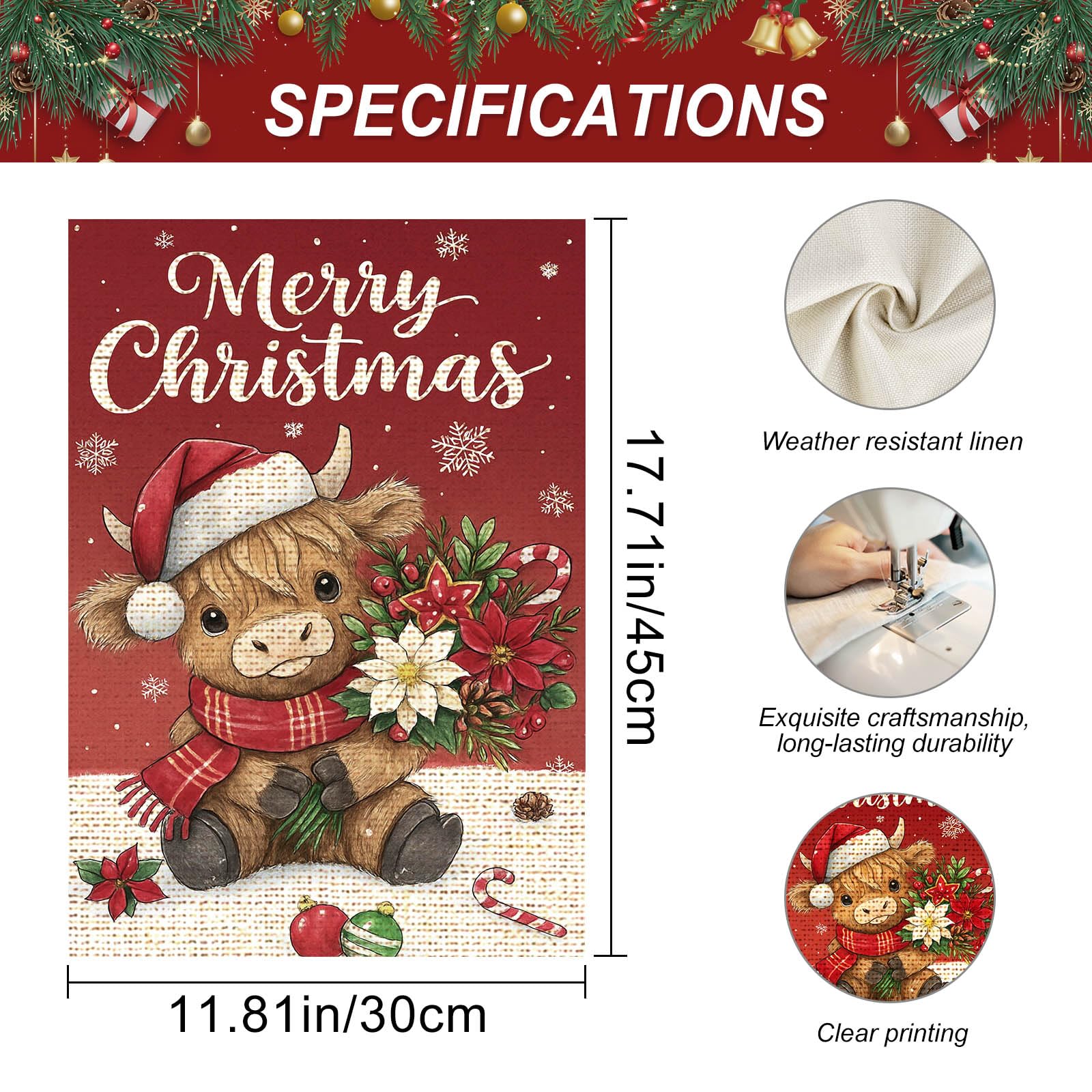 - Highland Cow Holiday Theme: Featuring a sweet Highland cow in a Santa hat holding poinsettias and candy canes, this Christmas garden flag brings playful charm to your lawn or porch decor.