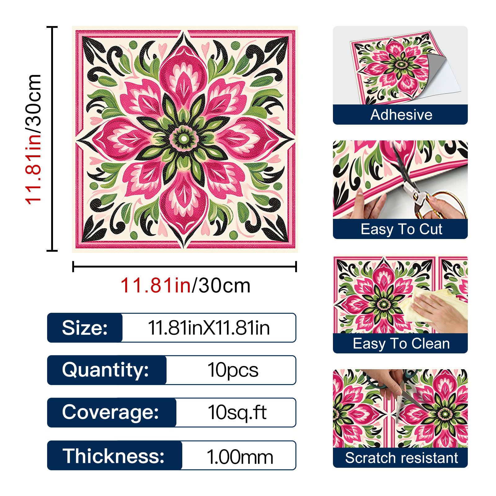 - easy-clean surface:smooth pvc finish wipes clean with a damp cloth to remove dust, splashes, or stains. great for daily use in busy rooms like kitchens and foyers. avoid abrasive pads to preserve your vinyl flooring or tile stickers and keep them looking fresh.