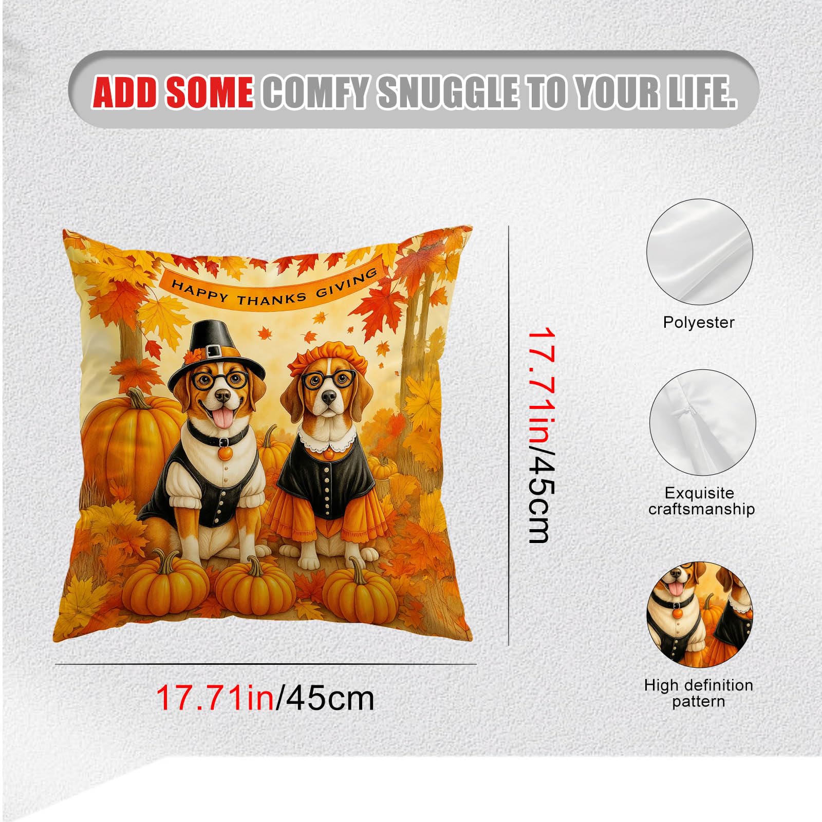 - Set of 2 Pillow Covers: Add a touch of humor and charm to your fall decor with this set of 2 pillow covers featuring adorable beagles in pilgrim costumes surrounded by pumpkins. Perfect for Thanksgiving gatherings.