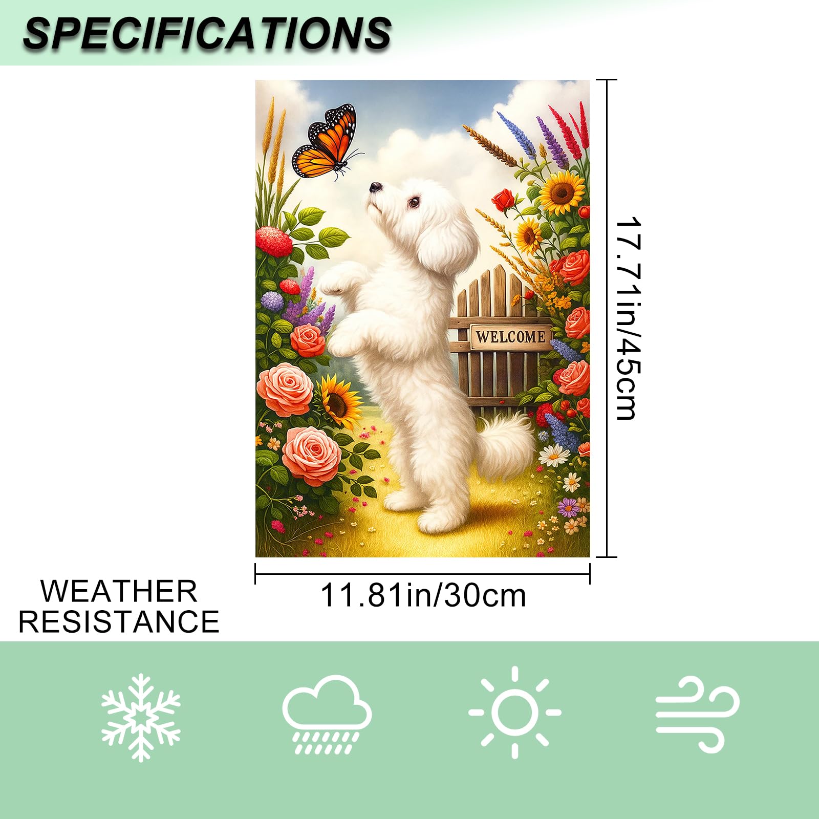 - Quality Polyester Fabric: The welcome garden flag use upgraded spun polyester, lightweight yet sturdy, with a smooth surface for crisp details and vibrant colors; Bichon Frise outdoor flag reinforced stitching withstand wind, rain, and sun.