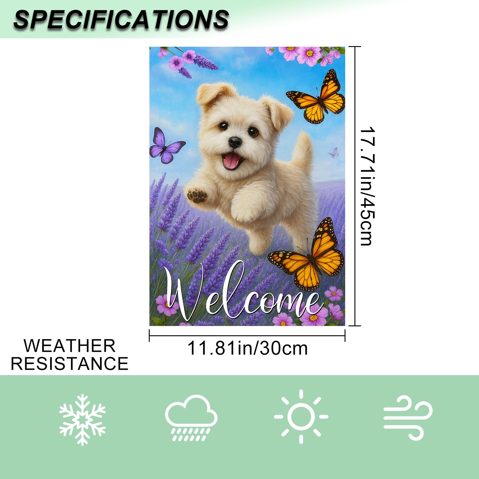 - Special Butterfly Puppy Design: Garden flag captures a playful White dog running among lavender blooms and butterflies beneath a clear sky. Soft purple and orange shades create a joyful, uplifting welcome for your garden or outdoor area.