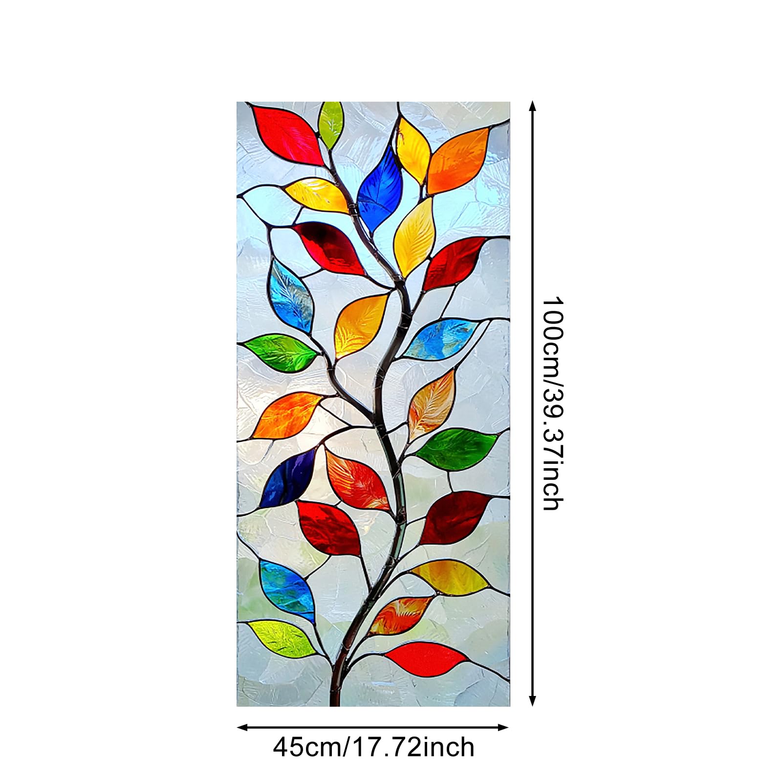 - Decorative Elegance: This stained glass window film showcases a flowing tree branch design filled with vibrant multicolor leaves bringing a striking focal point to any room The layered rainbow effect transforms plain glass into a stained glass window film masterpiece offering a stylish privacy solution